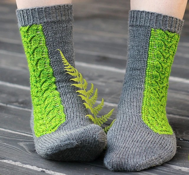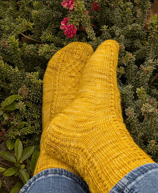 Last, but not least, we have a fun pair of socks featuring simple cables down the top of the foot and back of the leg. Stick with a more tonal/solid fingering weight yarn to make all that cabling work worth it and get those tootsies all toasty.